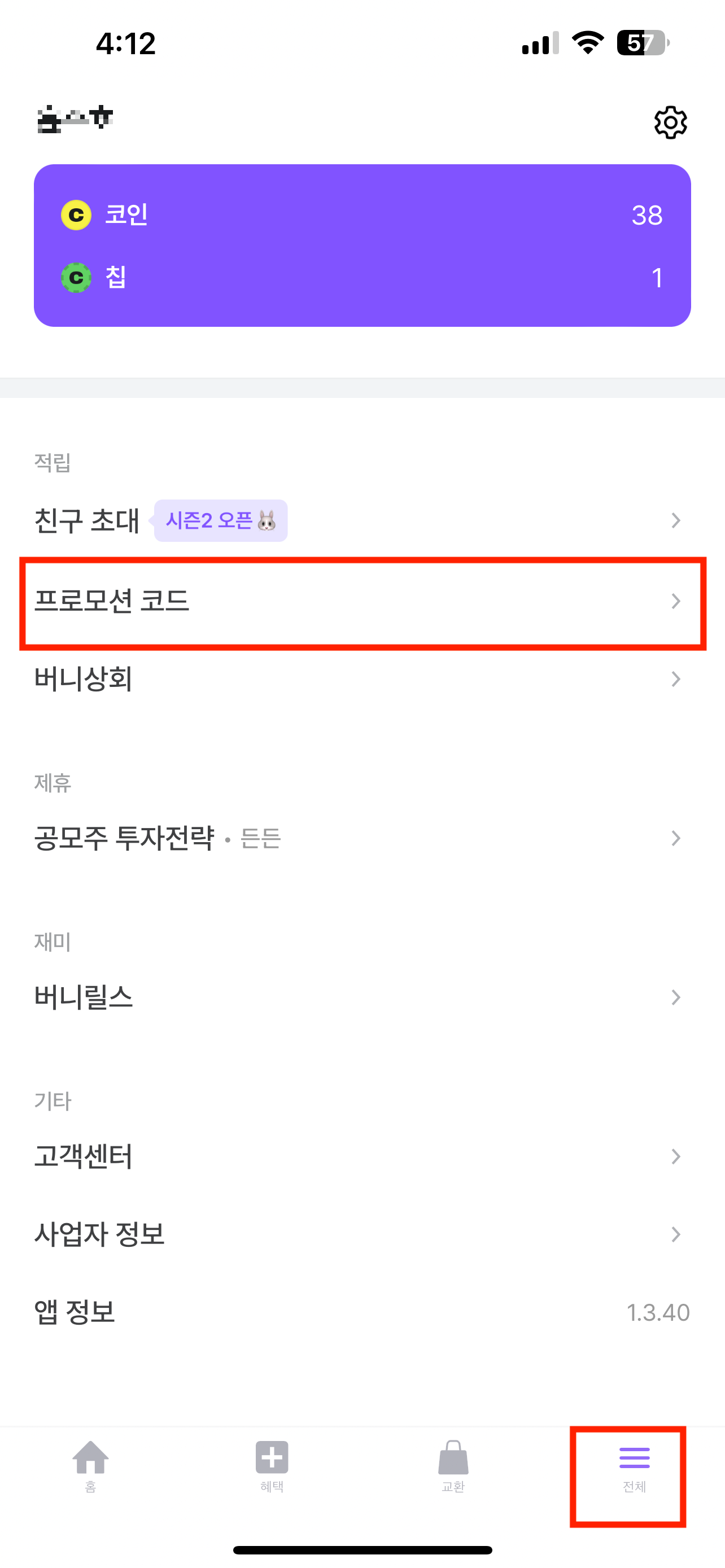 화면 아래쪽에 [혜택]에 들어간 뒤 [친구초대]를 선택하면 나의 코드를 확인할 수 있습니다. 그럼 초대받은 친구는 [전체]→[프로모션 코드]에 들어가서 나의 코드를 그대로 입력하기만 하면 끝이에요