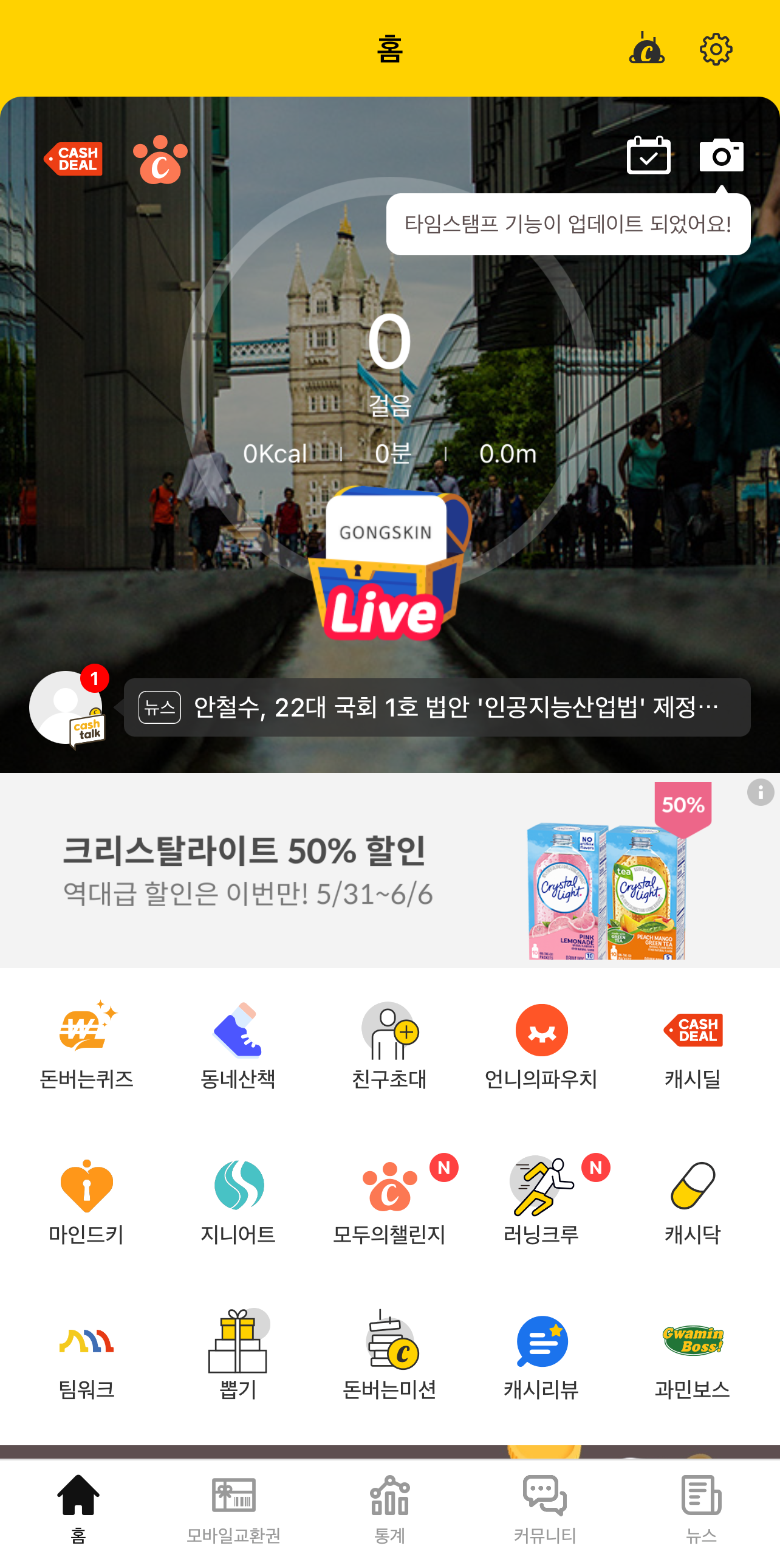 캐시를 모을 수 있는 상태가 되면 화면 중앙부분에 숫자가 떠오르는데, 타이밍에 맞추어 화면을 탭해줘야 캐시가 적립되고 타이밍을 놓치게 되면 그 날의 캐시 리워드는 받을 수 없게 됩니다. 100걸음마다 1 캐시를 적립하는데 하루에 최대 100캐시까지 적립이 가능하니 일일 만보를 걷도록 유도해줍니다.