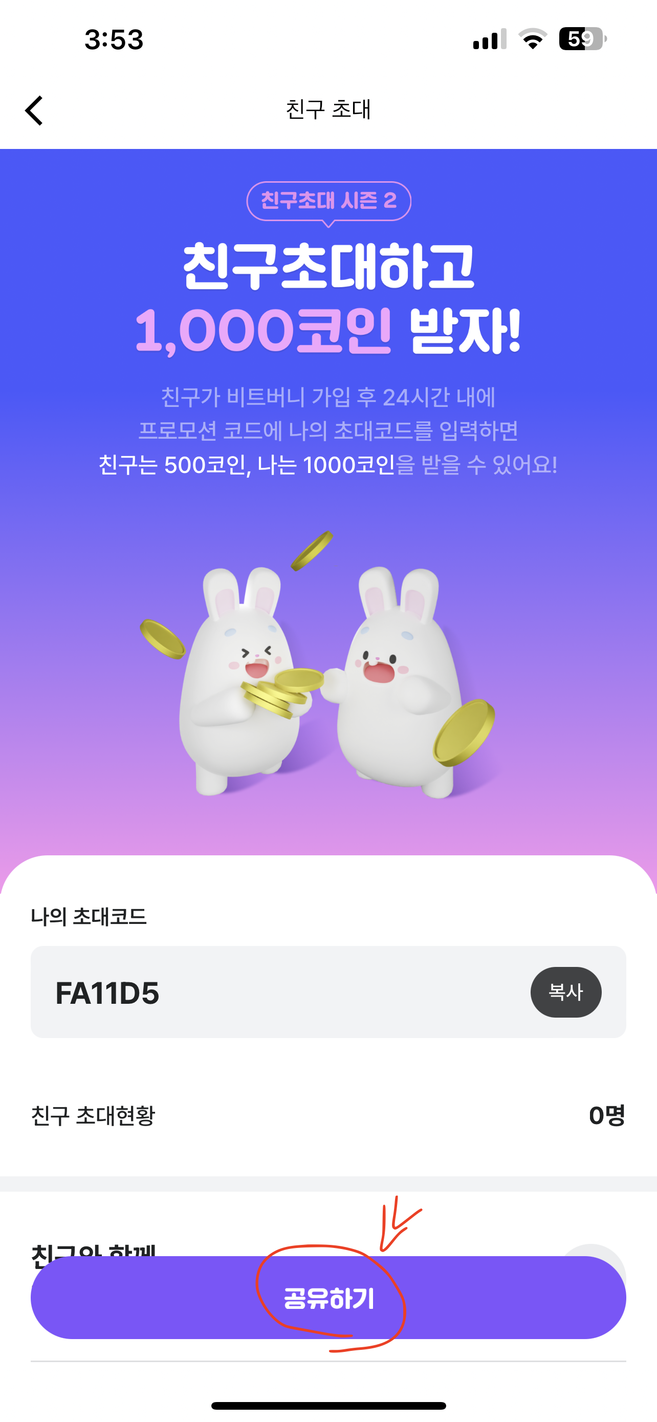 나의 소개로 친구가 비트버니를 다운받으면 1,000코인을 받을 수 있어요. 다른 이벤트보다 가장 혜택이 좋고 간단한 방법으로 친구도 초대코드를 입력하게 되면 500코인을 받을 수 있어 서로에게 좋은 방법이라고 할 수 있어요.